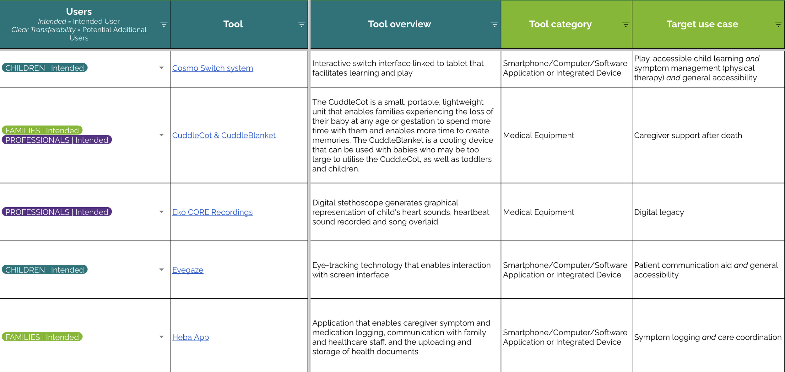 The technology in the children’s palliative care tech library maps the existing technologies shaping children’s palliative care today. Use it to identify ideas for applications in your context, or note where innovation gaps may exist.